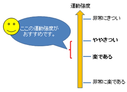 心臓リハビリテーションの適切な運動強度は、下記の表に示すように、『楽である』から『ややきつい』の範囲内で運動を行います。
