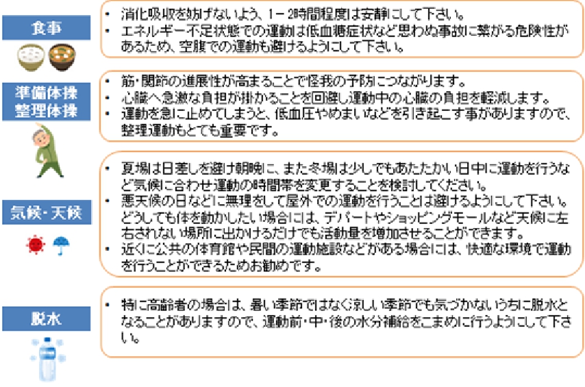 食直後の運動は避け、気候や天候に合わせて運動を行うようにして下さい。また、準備体操や水分補給にも気を付けるようにしましょう。