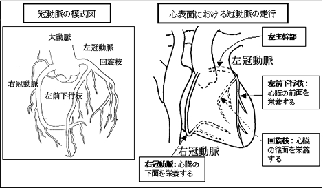 冠動脈には、心臓の表面を走る3本の主要な枝があります。心臓の前面を栄養する左前下行枝、後面を走る(左)回旋枝、および心臓の下面を栄養する右冠動脈です。