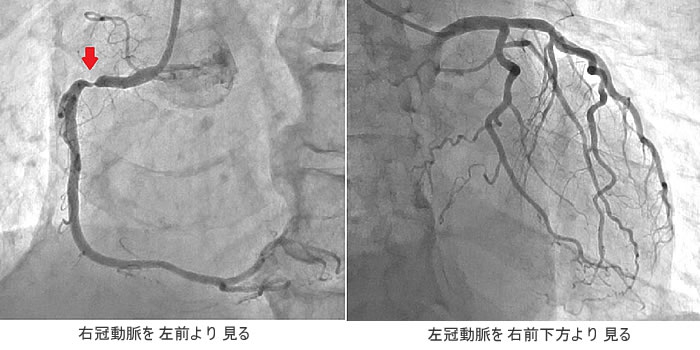 右冠動脈に狭窄病変(上左図の矢印部)があることがわかります。左冠動脈には目立った異常はなさそうです。(上右図)左右の冠動脈に対していろいろな方向から撮影を繰り返し、全体像を作り上げるわけです。