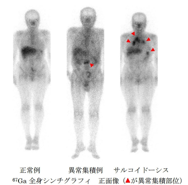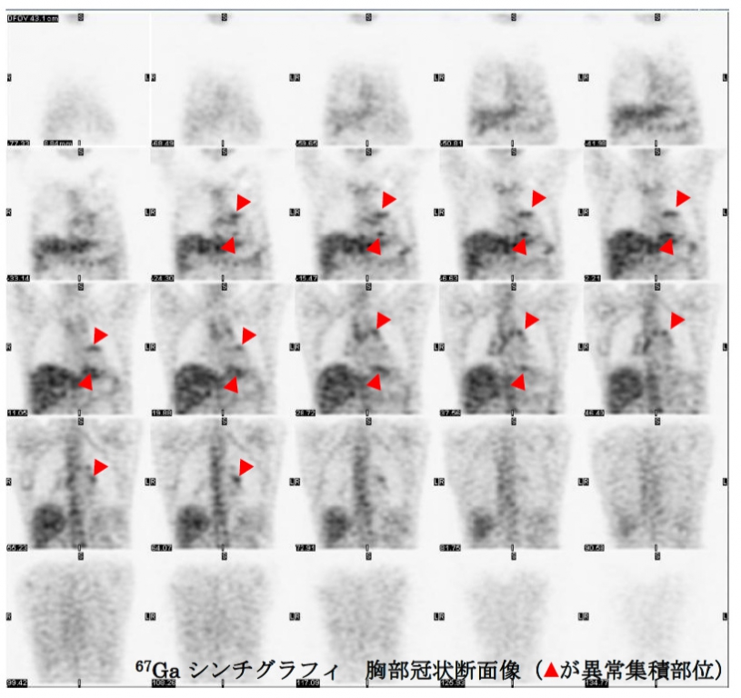 RI(67Ga-citrate)の腫瘍、炎症への異常集積を調べます。サルコイドーシスでは、心臓、縦隔リンパ節への集積が高くなります。