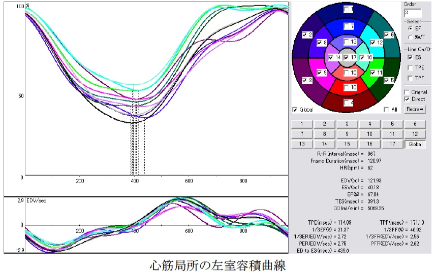 心筋の極座標表示で17分割した各領域の心機能評価を行っています。数字の□に印(☑)のある領域について容積曲線を表示し、領域と曲線の色が対応しています。左室の総合的な容積曲線は黒線で示してあります。