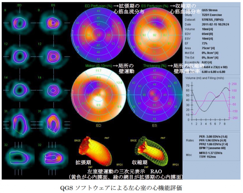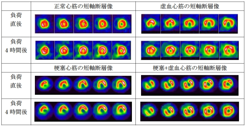 運動負荷やAdenosine薬剤負荷中に、RIを静脈注射して心筋各部への血流量をRIの集積度合いで評価します。安静時と比較することにより、負荷時の心筋虚血や梗塞の程度を調べます。心電図と同期を取って撮像することで、心機能評価も可能です。