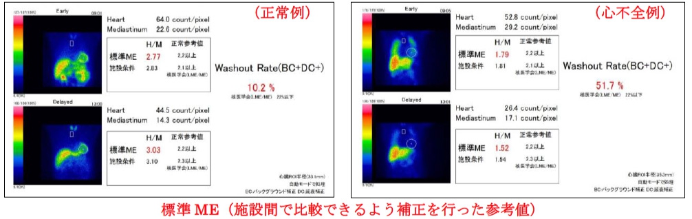 慢性心不全の病態に大きく関与する心臓交感神経機能を画像化し早期像H(Heart)/M(Mediastinum)比、後期像H/M比及び、Washout rate(WR)の定量指標より心不全の重症度や予後評価に有用です。