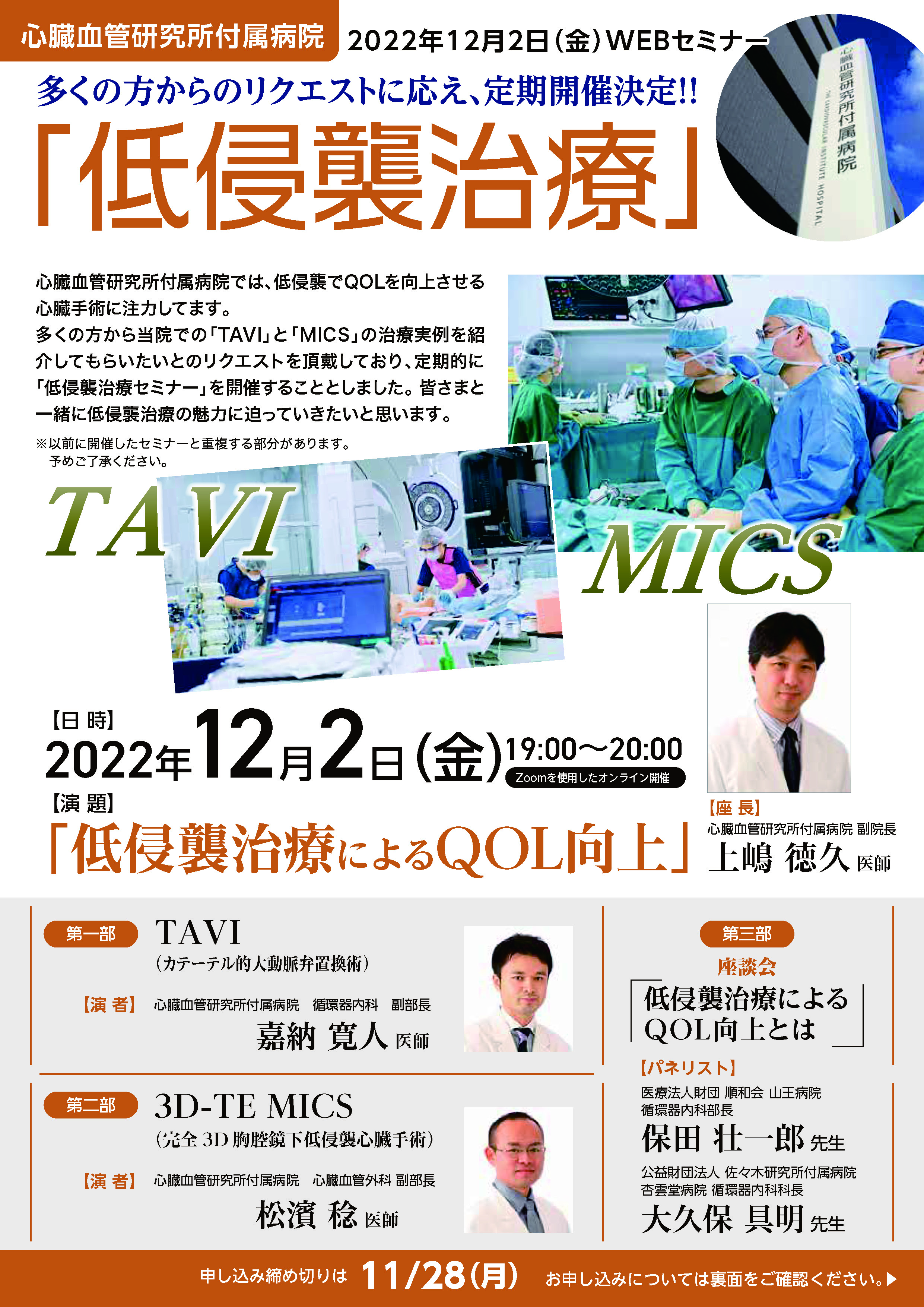 今回は過去開催し、ご好評のため定期開催することといたしました低侵襲治療セミナーの一環として、当院で注力している低侵襲の心臓手術「TAVI」と「MICS」の魅力や、低侵襲治療によるQOL向上についてお話させていただきます。皆様のお役に立つ情報連携の場となれば幸いです。