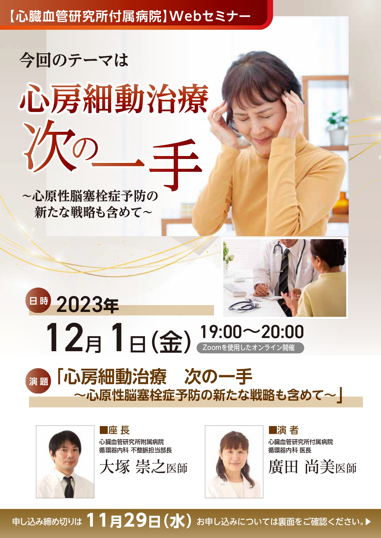 演 題:心房細動治療 次の一手 ~心原性脳塞栓症予防の新たな戦略も含めて~ 座 長:心臓血管研究所付属病院 循環器内科 不整脈担当部長 大塚 崇之 医師 演 者:心臓血管研究所付属病院 循環器内科 医長 廣田 尚美 医師 |